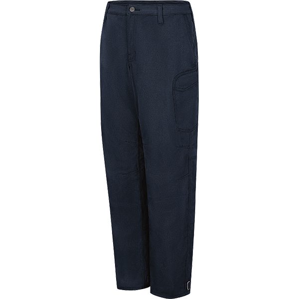 Uncompromising FR protection meets dual-compliant performance. Contoured waistband for added comfort. Metal shank button closure. Triple-needle felled side and seat seams offer superior durability. Articulated knees for ease of movement. Two slack-style front pockets with utility notches. Two rear welt pockets with closures. Adjustable ankle straps to secure leg bottom around work boots. Two ergonomic cargo pockets with hook-and-loop closures.